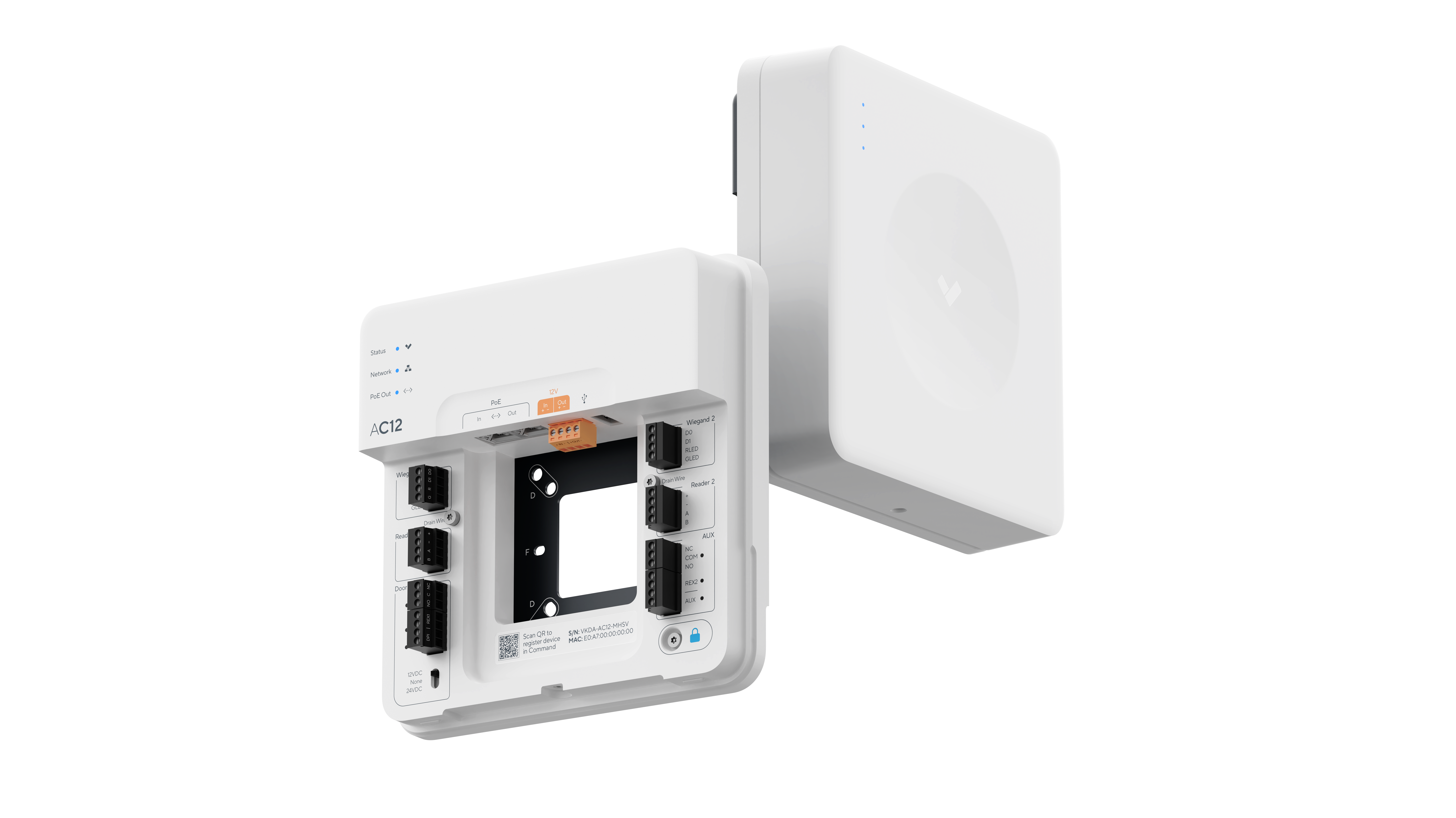 The AC12 provides cloud-managed access control for a single door. Supports mobile credentials, badge readers, and PIN entry through Verkada Command. Native camera integration links video to access events for visual verification.